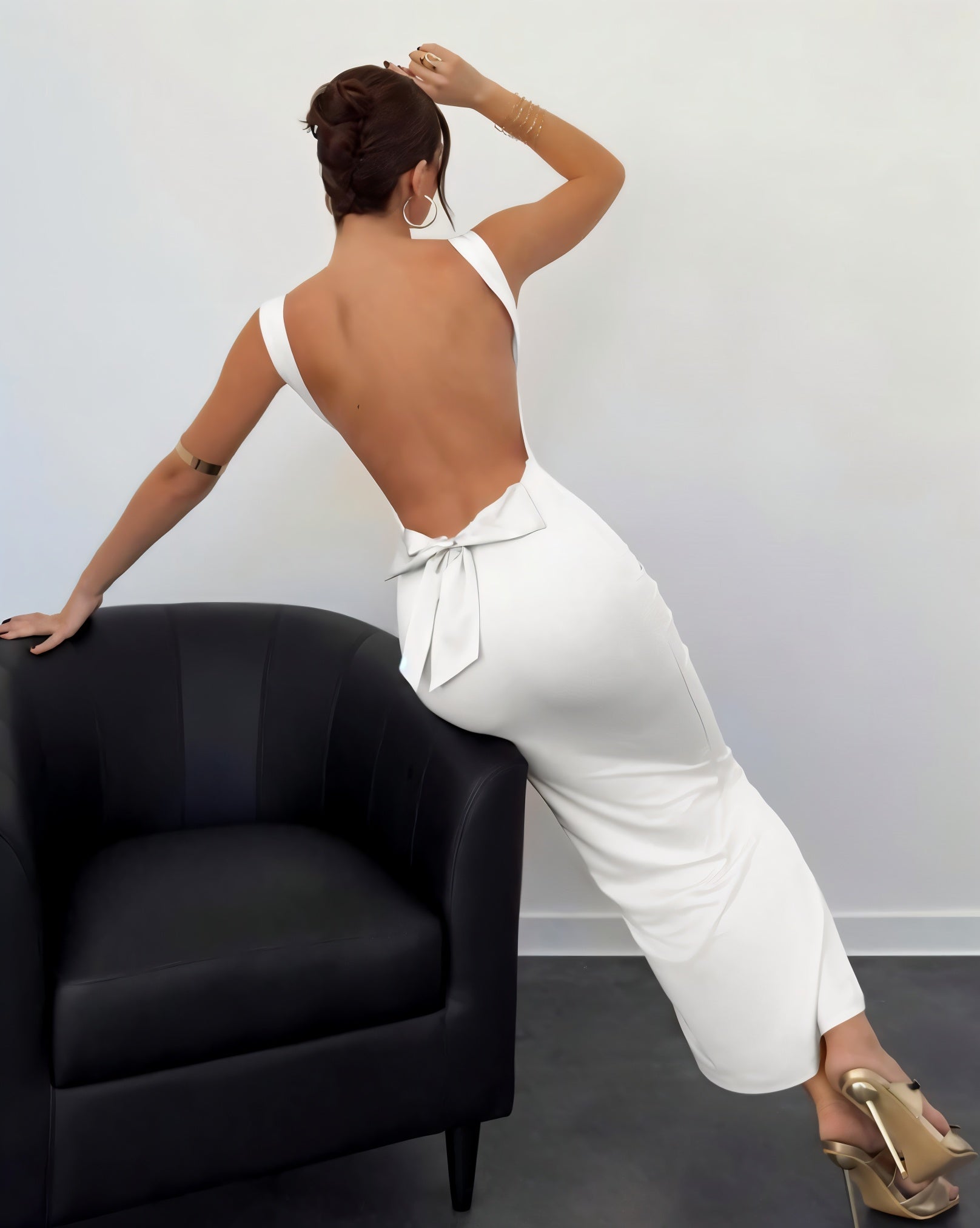 • Open back with satin bow tie detail